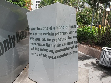 In Brisbane, eine geschichtsträchtigen Hafenstadt an der Ostküste des kleinen Kontinents Australien, ereilte mich mal wieder ein solches Gefühl. Eher fühlte ich mich angezogen, mitgezogen. Nach einem heftigen Platzregen wanderte ich über den Vorplatz des Brisbainer Rathauses. Ausruhen wollte ich für einen Moment. Der Regen hatte die Luft gereinigt. Die graue Wolkendecke war aufgelöst. Die Sonne strahlte wieder auf die nassen Steine. Ich ließ mich an einem öffentlichen Kunstwerk nieder.