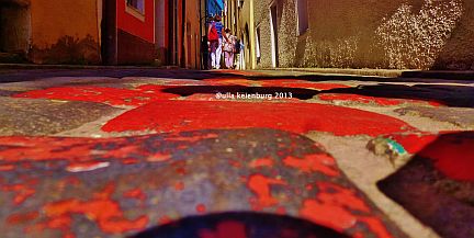 Der Blick senkend war klar: Dem Kopfsteinpflaster und seinen Verzierungen konnte das Wasser nur bedingt etwas anhaben.